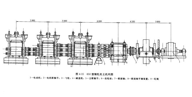 圖4-15所示為650型鋼軋機(jī)主機(jī)列圖,電動(dòng)機(jī)1的運(yùn)動(dòng)和力矩通過電動(dòng)機(jī)連軸節(jié)2,減速機(jī)4,朱連軸節(jié)5,齒輪座6和連接軸7傳遞給軋輥9,在此傳動(dòng)中設(shè)置了飛輪3及聯(lián)軸節(jié)平衡裝置8.