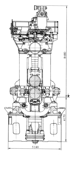 國產(chǎn)1150初軋機的主傳動形式為兩個低速直流電動機(功率4560kw,轉(zhuǎn)速0-70-120r/min)通過萬向連接軸分別傳遞兩個軋輥。上軋輥的主連軸器放在下軋輥主電機的上面。工作滾名義直徑為φ150mm,重車后較小直徑為φ1080mm,輥身長度為2800mm。1150初軋機的工作機座如圖3-1所示。他是由軋輥部件,機架部件,壓下平衡裝置等組成,但是每個部件都有其自己的特點,與板帶軋機和型鋼軋機不同。