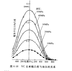 圖6-38所示為 VC支承輥凸度與油壓的關(guān)系,軋輥凸度的形式類似于正弦曲線,且軋輥的中間凸度值與壓力成正比。較大凸度取決于VC輥的結(jié)構(gòu),因此,選擇適合于軋制條件的輥套型式,即能夠獲得理想的軋輥凸度。圖6-38是在工作壓力為0~50MPa,響應(yīng)速度為10MPa/s,調(diào)壓精度為0.5%,采用多元醇脂油和旋轉(zhuǎn)接頭的較大轉(zhuǎn)數(shù)為 500r/min 的條件下做出來的。